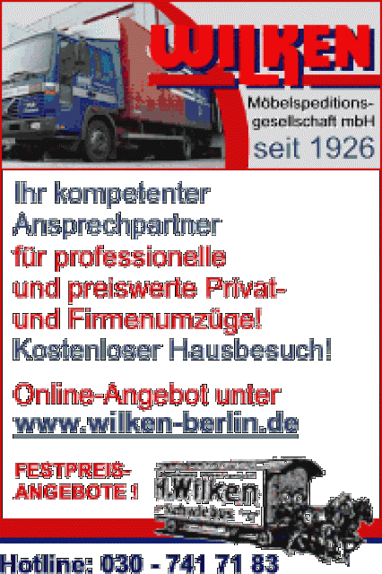 Die Wilken Möbelspeditionsgesellschaft m.b.H. ist seit 1966 Rahmenvertragspartner der Berliner Sparkassen und seit Oktober 2000 der Bankgesellschaft BerlinWir sind ein kompetenter Ansprechpartner für Privat- und Büroumzüge.Unser fachkundiges, leistungsfähiges und zuverlässiges Personal wird regelmäßig geschultund weiß alle Anforderungen eines Umzuges zu bewältigen.Wir sind seit 1965 anerkanntes Mitglied der AMÖ Fachbetrieb und im Verband Verkehr und Logistik Berlin und Brandenburg e.V. (VVL)Sehr geehrte Damen und Herren, sehr geehrter Kunde!Die Nachfrage bestimmt den Preis, auch den Umzugspreis. Bei den meisten Umzugsfirmen sind die Umzugspreise um den Monatsanfang bzw. um das Monatsende hin teurer, weil in diesen Zeiten die meisten Umzüge stattfinden.Um einen günstigen und angemessenen Umzugspreis zu erhalten, müssen deshalb Kunden ihren Umzug auf einen Zeitpunkt verlegen, in dem weniger Umzüge nachgefragt werden.Die Wilken Möbelspeditionsgesellschaft mbH hat zu jeder Zeit einen günstigen, fairen und angemessenen Preis, unabhängig davon, ob Sie zum Monatsanfang, zum Monatsende oder in der Monatsmitte umziehen. Unser Kunde ist König und kann sich auf auf einen fachmännischen und günstigen Umzug verlassen.Ihre Möbel bekommen bei uns keine Beine, allerdings soll Ihr Umzug für Sie zu einem stressfreien Ereignis werden.Unsere Mitarbeiter werden Sie stets hilfreich und freundlich bei Ihrem Umzug unterstützen, unabhängig davon, ob Sie 20 oder 70 Jahre alt sind. Wir suchen und finden die richtige LösungWir freuen uns, Sie umziehen zu dürfen.Die Wilken Möbelspeditionsgesellschaft mbH